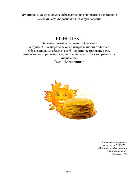 КОНСПЕКТ образовательной деятельности (занятие) в группе №3 общеразвивающей направленности от 4-5 лет. Тема: «Масленица». Воспитатель МДОБУ Детский сад "Боровичок" п.Колтубановский Рываева И.Ф.