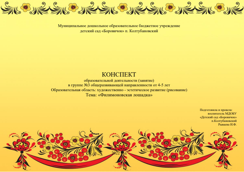 КОНСПЕКТ образовательной деятельности (занятие) в группе №3 общеразвивающей направленности от 4-5 лет Тема: «Филимоновская лошадка». Воспитатель МДОБУ «Детский сад «Боровичок" п.Колтубановский Рываева И.Ф.