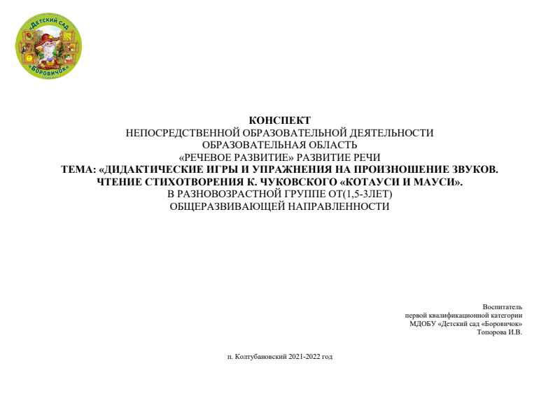 ТЕМА: «ДИДАКТИЧЕСКИЕ ИГРЫ И УПРАЖНЕНИЯ НА ПРОИЗНОШЕНИЕ ЗВУКОВ. ЧТЕНИЕ СТИХОТВОРЕНИЯ К. ЧУКОВСКОГО «КОТАУСИ И МАУСИ». Воспитатель МДОБУ «Детский сад «Боровичок» Топорова И.В.