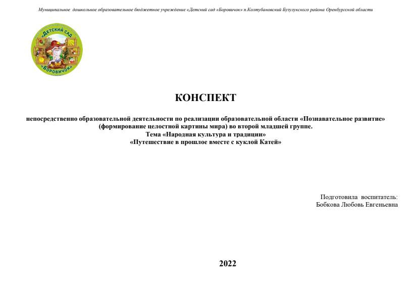 «Путешествие в прошлое вместе с куклой Катей» Воспитатель Бобкова Любовь Евгеньевна
