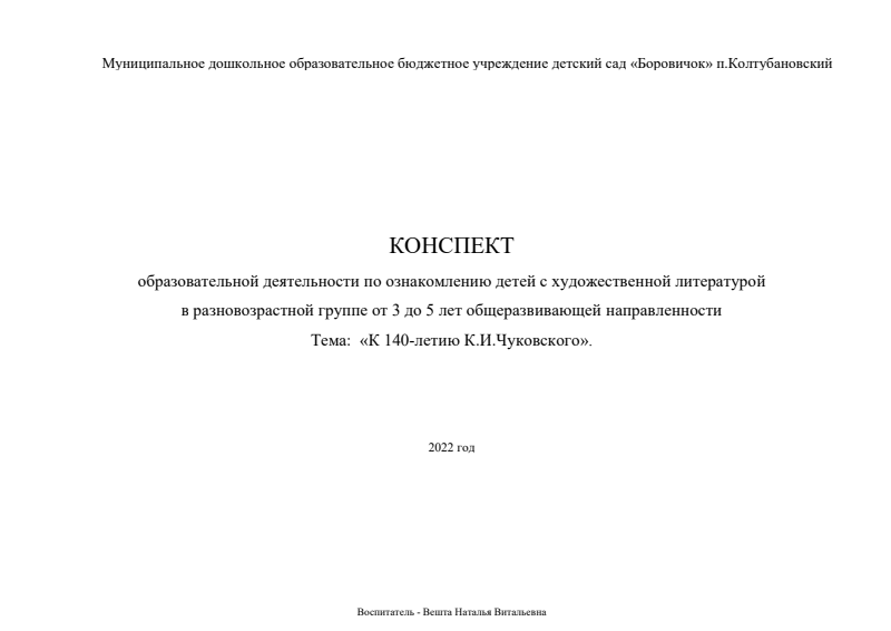 КОНСПЕКТ ОД по ознакомлению детей с художественной литературой в разновозрастной группе от 3 до 5 лет общеразвивающей направленности. Тема: «К 140-летию К.И.Чуковского». Воспитатель Вешта Н.В. детский